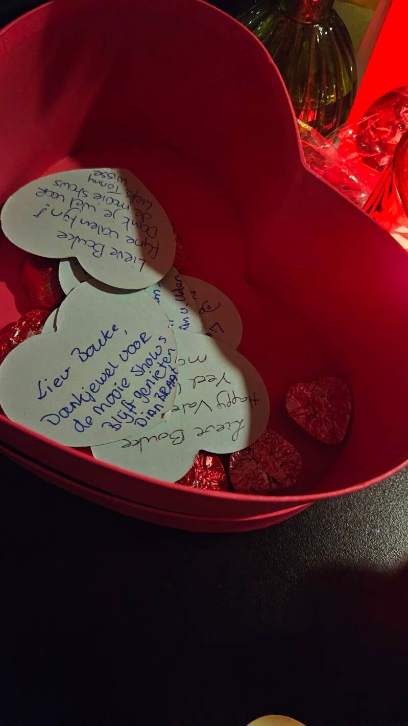 Ik had namelijk allemaal kartonnetjes in de vorm van een hartje, waarop het publiek die avond een leuk berichtje voor Bouke kon schrijven.