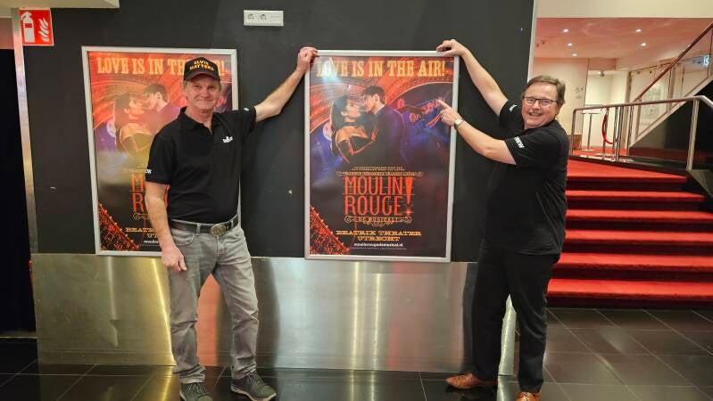 Omdat ik het zó waanzinnig vind dat Bouke in (een deel van) het decor van Moulin Rouge mocht stralen, wilde ik dat uiteraard op een ludieke manier vastleggen, dus liet ik de heren van de merchandise shinen naast de prachtige promoposters van Moulin Rouge, waarop sinds kort April Darby afgebeeld staat naast Martijn, de nieuwe Satine.